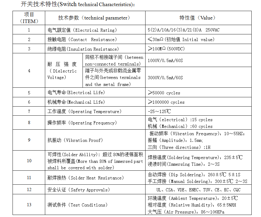 | 1 | বৈদ্যুতিক রেটিং | 5(2)A/10A/16(3)A/21(8)A 250VAC | |