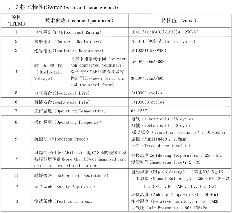 | 1 | বৈদ্যুতিক রেটিং | 10(1.5)A/16(3)A/10(3)A 250VAC | |