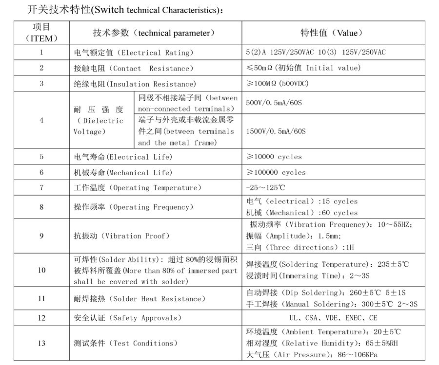 | 1 | বৈদ্যুতিক রেটিং | 5(2)A 125V/250VAC 10(3)125V/250VAC | |