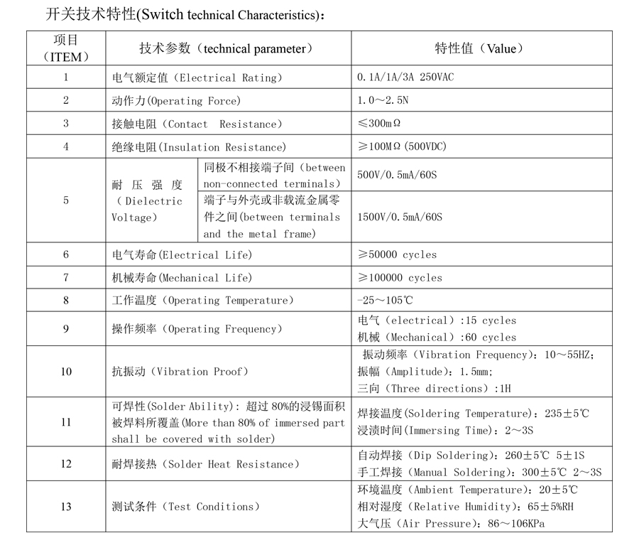 | 2 | অপারেটিং ফোর্স | 1.0-2.5N | |