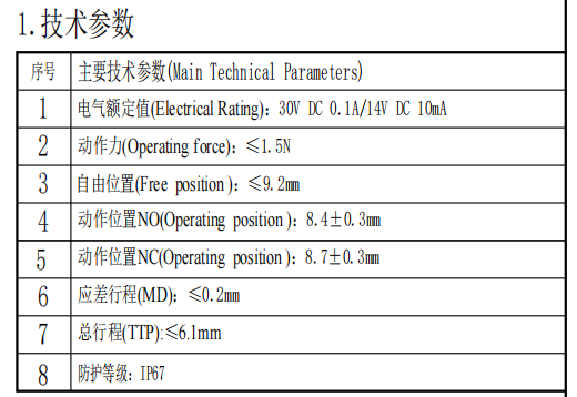 | 1 | বৈদ্যুতিক রেটিং | 10 এমএ 14 ভি ডিসি/0.1 এ 30 ভিডিসি | |